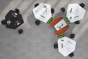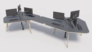 The first thing to say about these desks is that they’re not rectangular. They’re not square or round either, but a trapezium shape that forms a hexagonal ‘cell’ designed to maximise workspace efficiency and support collaboration and communications within and between teams.