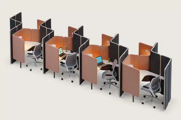 Flex your workplace: these easy-to-move units are mounted on castors with a simple table-mounted locking system. Cleverly designed to gain maximum effect as a mobile workspace whilst covering a minimal footprint, these small but mighty mobile booths can tuck away or take centre stage. Their mobility also makes it easy to mount them side-by-side when an increased collaboration area is needed. Available with open top, louvered and enclosed ceiling options. Talk to us about further options such as rechargeable battery storage to power your devices.