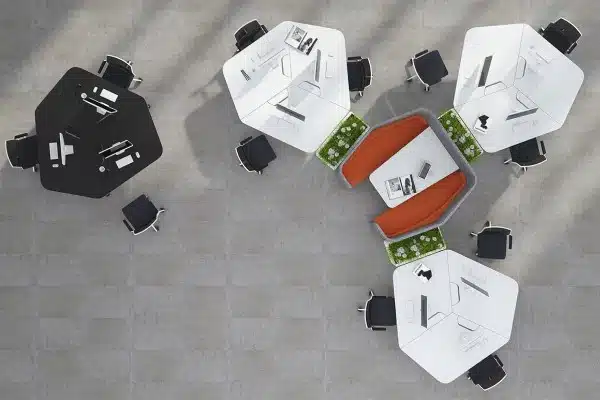 The Cell family of products responds to the needs of hybrid workers by combining individual workstations with various complementary elements to encourage interaction. The system can be easily reconfigured and provides spaces to Communicate and Collaborate as well as Concentrate and Contemplate. The fact that desk users sit closer than in normal workstations, and not directly face-to-face, ensures ease of conversation and encourages creativity.