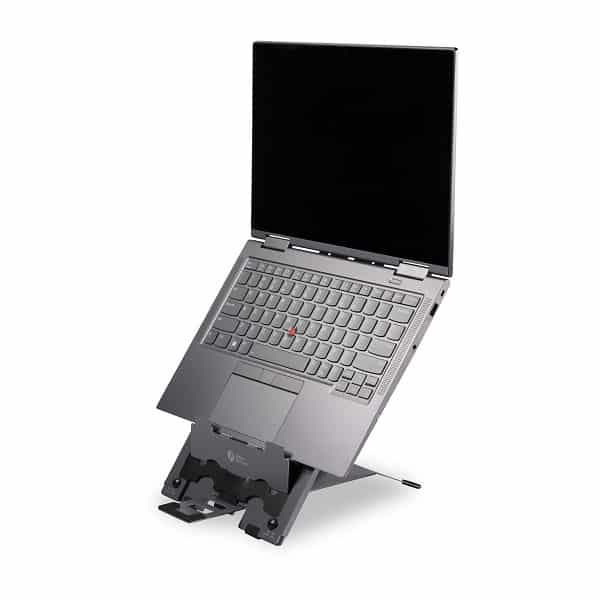 Easy to take out and about for remote or hybrid working, it is lightweight and can be folded completely flat. It can be instantly adjusted to seven different height positions which enables the screen to be raised to a comfortable viewing level, reducing strain on the neck and eyes and promoting a good working posture. The stable stand and anti-slip feet on the underside ensure a firm working setup on any surface.