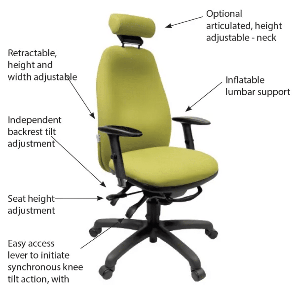 Adjustable Lumbar Support ensures the lumbar region is fully supported whilst seated. Helps to maintain the natural curvature of the lower spine.